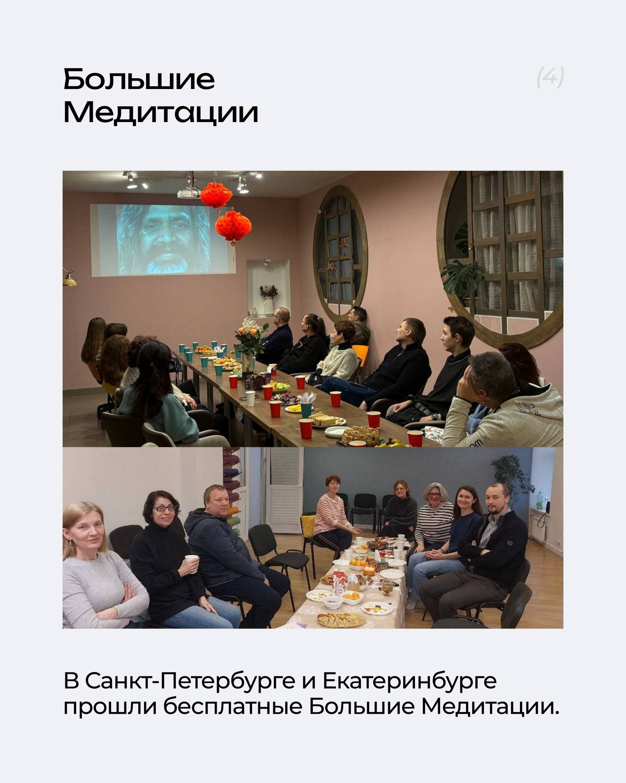 Каждый месяц в городах России проходят групповые практики Трансцендентальной Медитации, Шри Йога Асан и другие мероприятия, которые может посетить каждый, кто обучен ТМ.