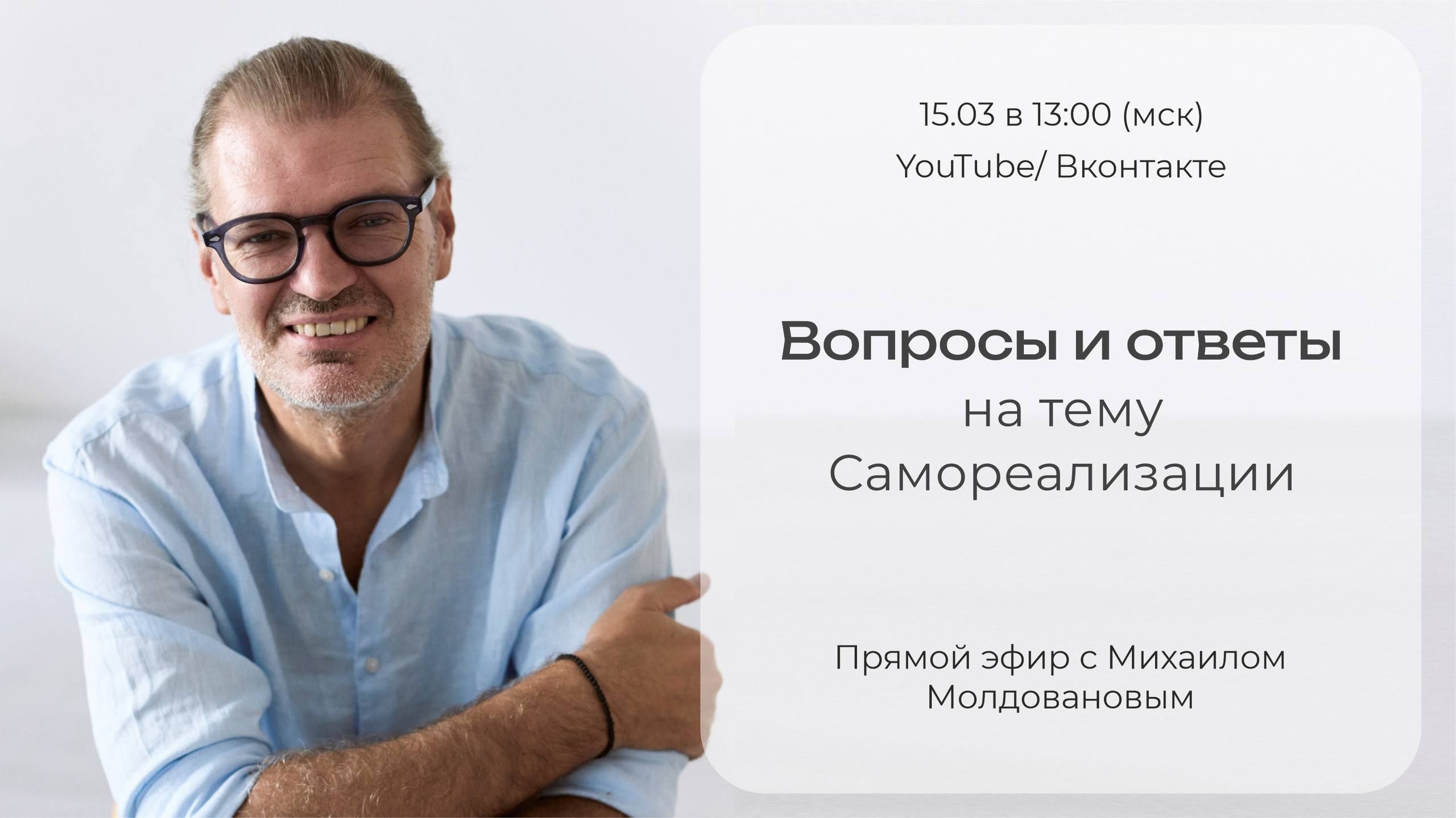 В это воскресенье, 15 марта, в 13:00 (мск) пройдёт прямой эфир «Вопросы и ответы на тему Самореализации», в ходе которого вы сможете задать все волнующие вас вопросы лично Михаилу.