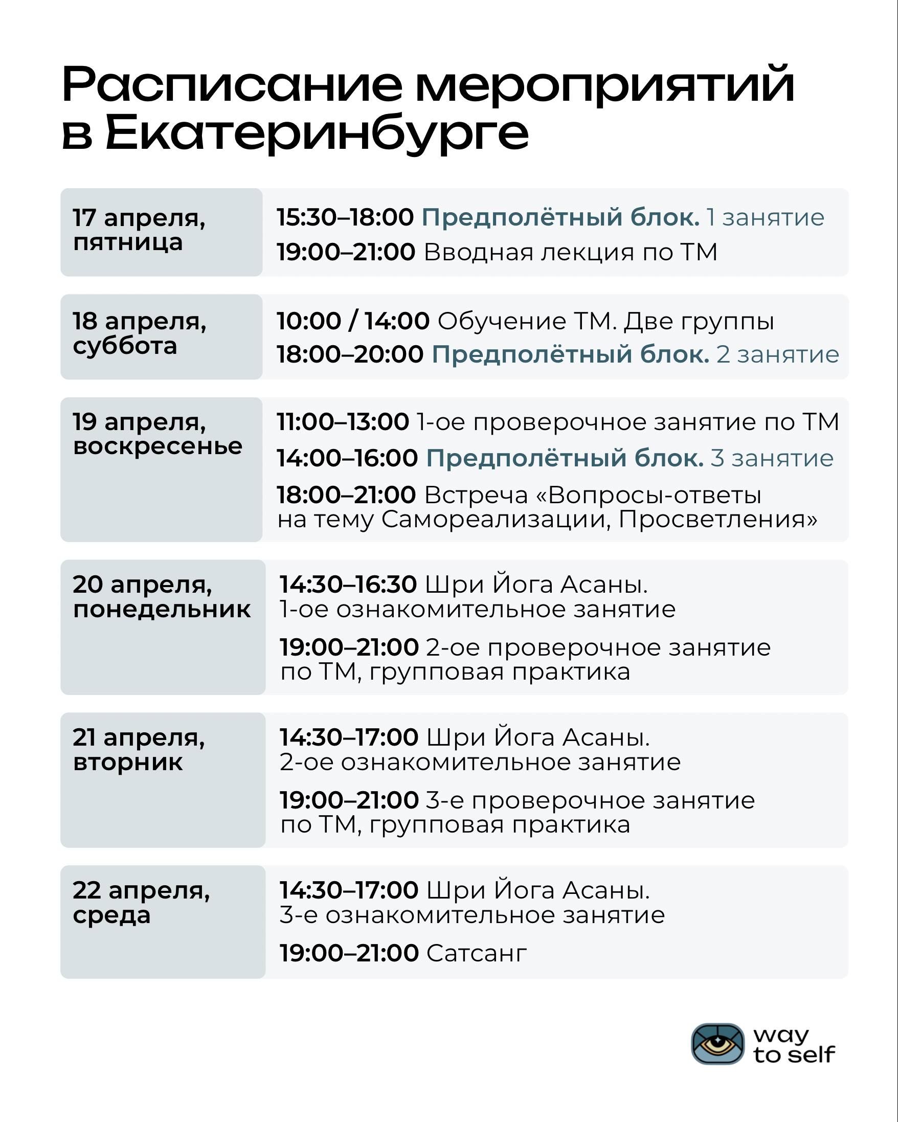 Также напоминаем, что у всех, кто уже обучен ТМ-Сиддхи, есть возможность повторно пройти любой из блоков программы. Это не просто оживит практику, а переведёт её на качественно другой уровень, благодаря повторному соприкосновению с источником техники Сиддхи.15.04.2026