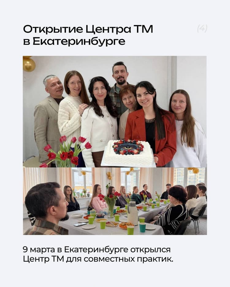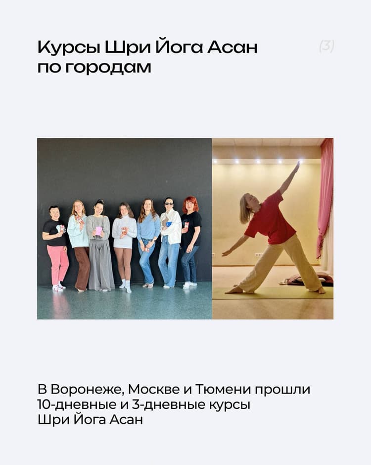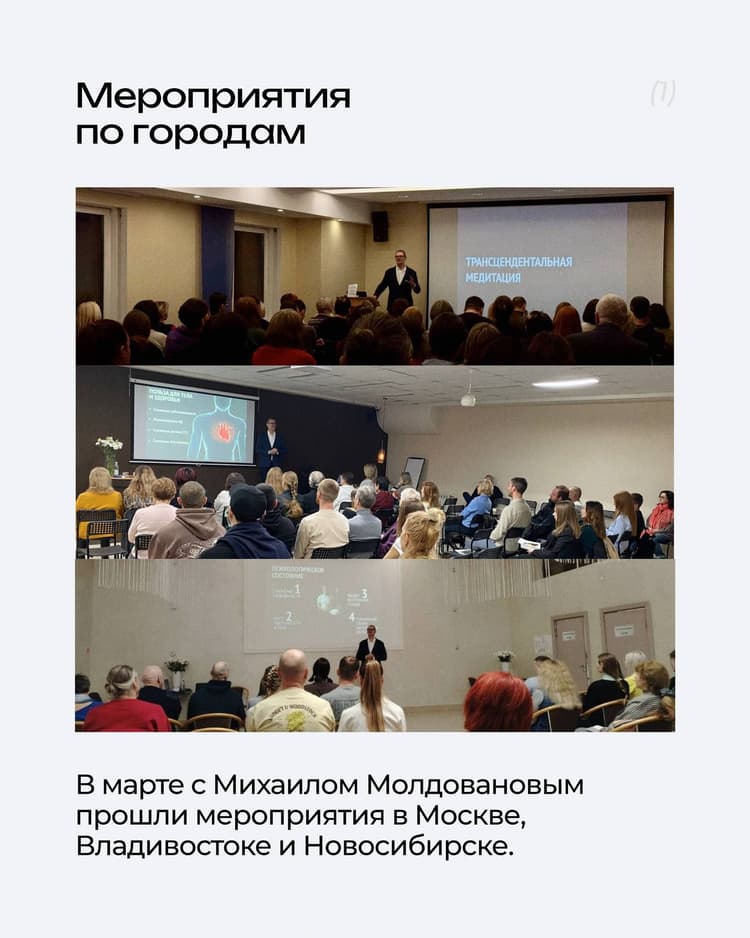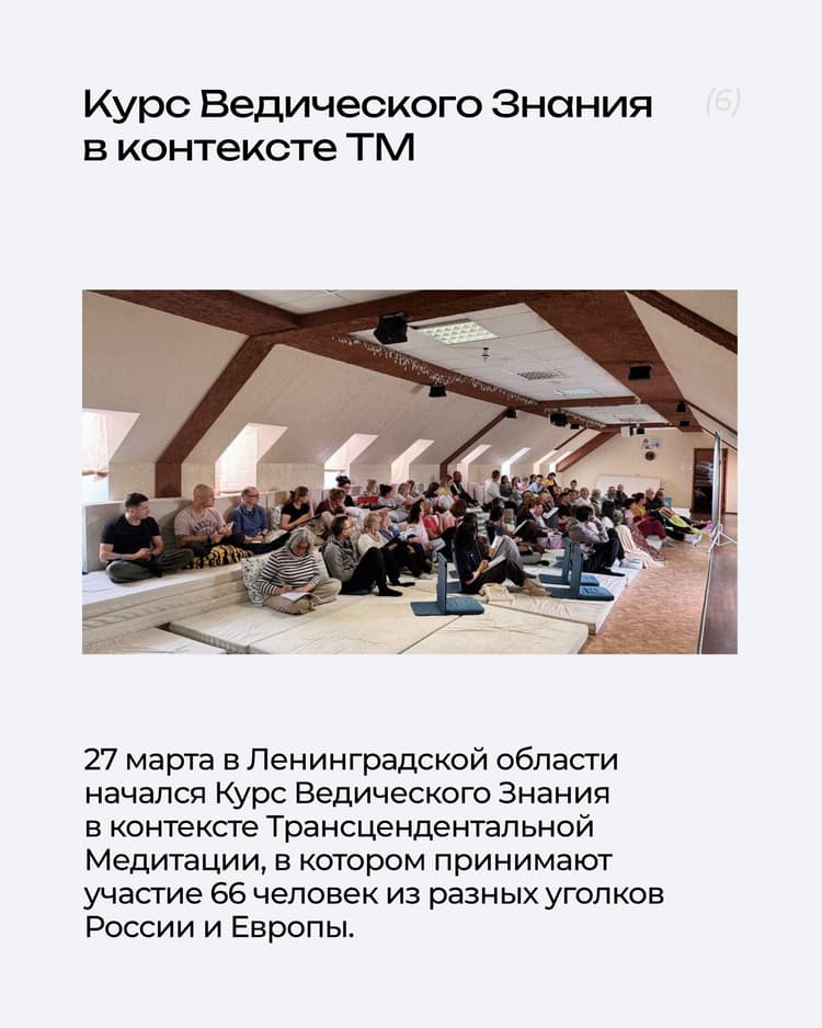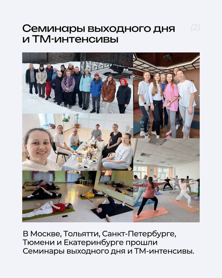 Каждый месяц в разных уголках нашей страны проходят групповые практики Трансцендентальной Медитации, Шри Йога Асан и другие мероприятия, которые может посетить каждый, кто обучен ТМ.