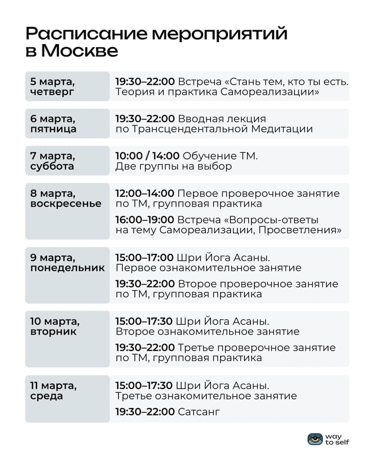 У нас работает система добровольных платежей для организации обучения и открытых лекций по Трансцендентальной Медитации. Вы можете внести свой вклад в развитие этой техники.