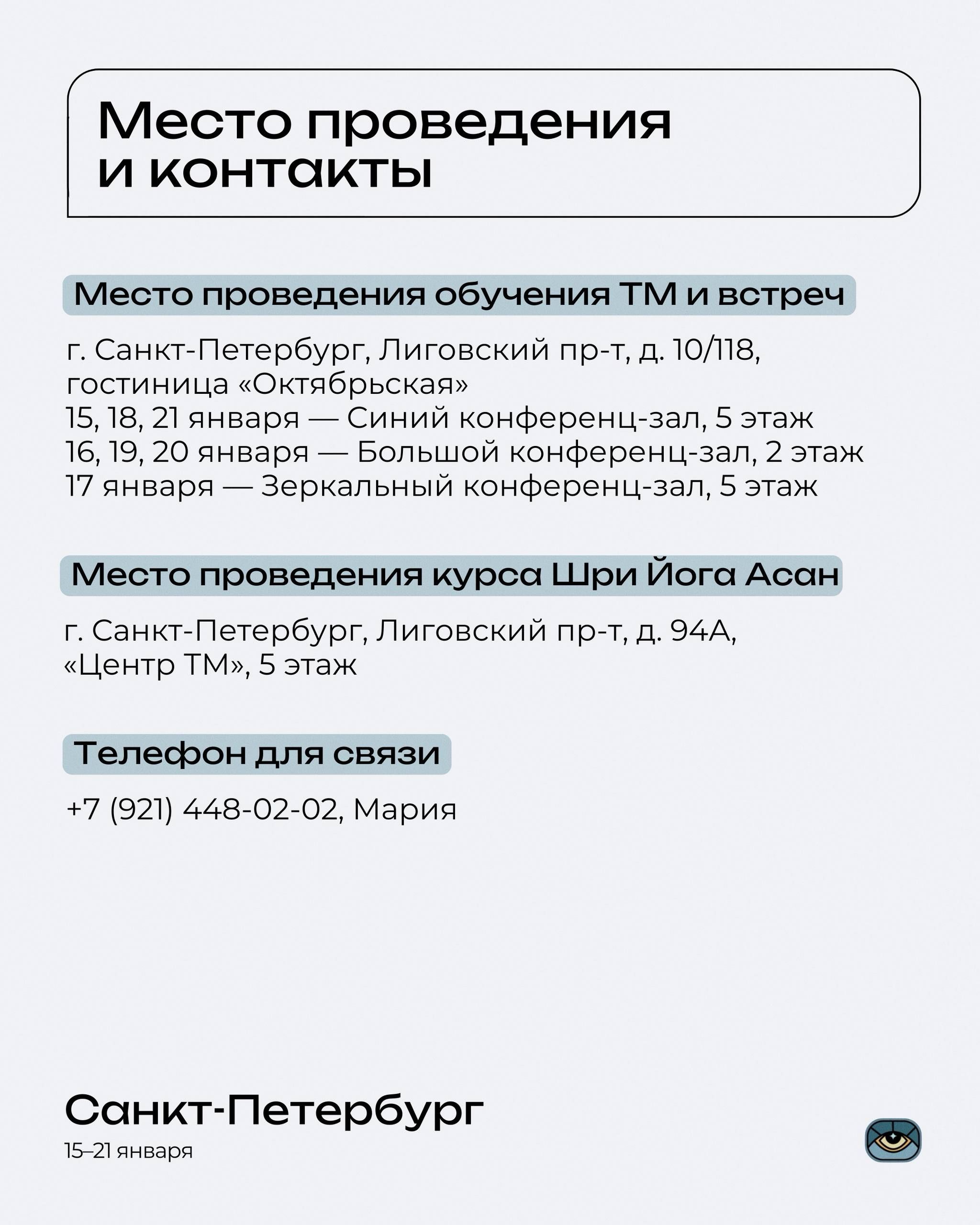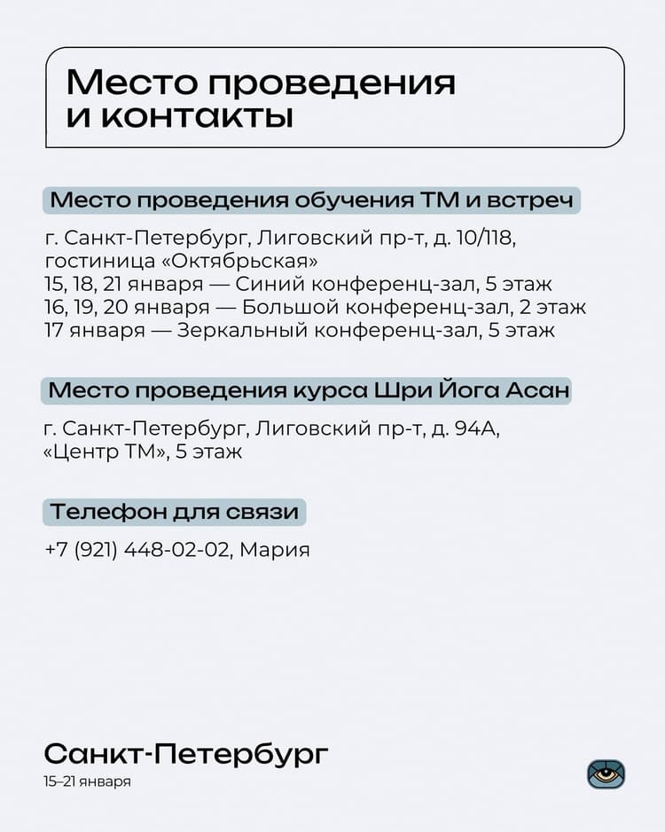 📍Место проведения обучения ТМ и встреч: г. Санкт-Петербург, Лиговский пр-т, 10/118, отель «Октябрьская»