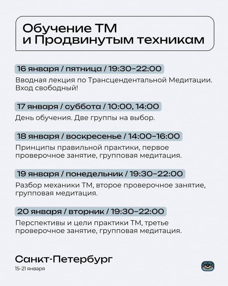 С 15 по 21 января приглашаем на обучение Трансцендентальной Медитации и Продвинутым техникам ТМ, ознакомительный курс Шри Йога Асан и встречи-сатсанги с Михаилом Молдовановым.