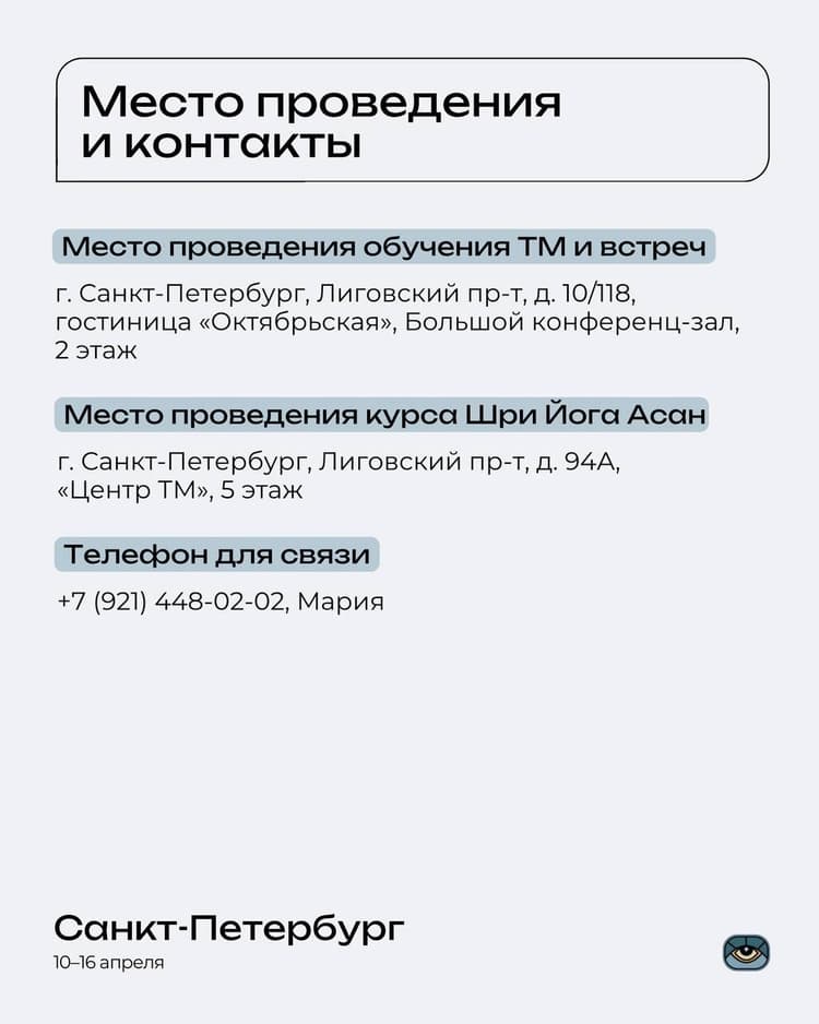 👆Чтобы зарегистрироваться на мероприятия (обучение технике ТМ, продвинутым техникам ТМ и ознакомительный курс Шри Йога Асан), перейдите по ссылке с названием города.