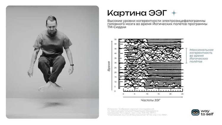 Изучение электроэнцефалограммы (ЭЭГ) показывает, что в момент, когда тело поднимается вверх, увеличивается когерентность волн мозга. Это связано с более эффективной коммуникацией и обработкой информации между разными областями мозга. Данное состояние считается показателем улучшения функциональной связи и интеграции мозговой деятельности, а также указывает на то, что мозг функционирует с максимальной эффективностью.
